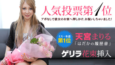 "ミス一本道総選挙でNo.1に選ばれた天宮まりるが登場。みんなチ〇コをむず痒くして待っていたことでしょう。お約束どおり1位に選ばれた彼女と交渉成立。最新のまりるをお届けできることになりました。いつどこで撮影をするのか彼女に伝えてませんでしたが、1位に選ばれたことで彼女もノリノリなんでアポなしで自宅に乗り込んでも大丈夫でしょう。お祝い事ですから。ゲリラ撮影花束挿入。まずは屋上で話を聞きます。インタビュー中から早速飛びッコを装着。涼しくなってきたんで部屋に入りましょうよ。あれよあれよとまりるちゃんの自宅公開!涼しいところにいたからかな、エッチする前にオシッコしとかなくっちゃ。カメラ持って追いかけなくっちゃ。今日はまりるちゃんのわがままを聞いてラブラブ彼氏彼女プレイ。何か料理をするとキッチンへ席を立った隙にベッドルームへダッシュ。ガサ入ります。まりるちゃん慌ててたねぇ。直径20cmの電マを発見しました。これ以上覗かれたくなかったら裸エプロンで料理してください。まりるちゃんの言うことはなんでも聞く約束でしたけどまんまと我々が主導権を握り始めます。ニンジンの皮を剥いてるところなんかどうでもいい。肛門の匂いを嗅いでみよう。嫌がったってもう糸引いちゃってるんで、そこのきゅうりくらい入るでしょう。ここまできたらもうまりるちゃんも料理どころじゃないです。自宅のキッチンで腰砕けてるところを撮影されるとは夢にも思ってなかったことでしょうね。軽く食べてお腹も満足したら性欲がムクムク。勝手知ったる自宅ですから隠してあった電マでオナるところを魅せてくれました。お祝いはまだまだ続きます。なんせ今回は1時間40分の超大作。「じゃぁあっちで気持ちいコトしよぉ」とまりるちゃんに手を引っ張られてベッドルームへ。スイッチの入ったまりるちゃん主導の欲求全部乗せセックスがここから始まります。"